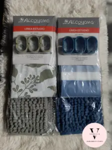 Cortina estampada, una alfombra de chenille y 12 ganchos.